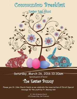 Please join St. John Church family as we celebrate the resurrection of Christ! Special message for the youth by Fr. Mesrop Ash. Followed by breakfast and Easter Egg Hunt.