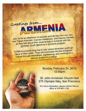 CYMA presentation by Tigran Antonian, Carmen Kestekyan and Naryne Sarkiss. They will share pictures and talk about thier experiences in Armenia with the Christian Youth Missions to Armenia program.
