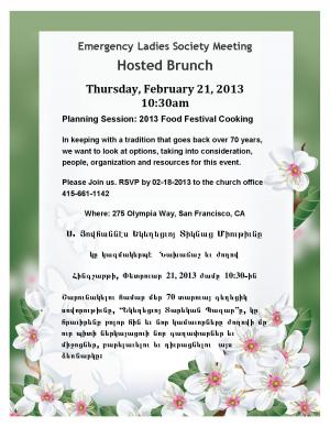 St. John Ladies Society hosted Brunch & Planning Session for 2013 Food Festival Cooking. In keeping with a tradition that goes back over 70 years, we want to look at options, taking into consideration, people, organization and resources for this event. Please join us. RSVP by 02-18-2013 to the church office 415-661-1142. All who have or are interested in participating cooking for the Food Festival are encouraged to come and participate.