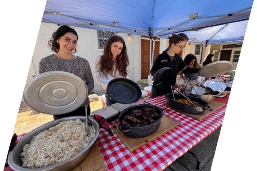 The delicious BBQ was lovingly prepared and marinated by a dedicated group of volunteers, while the ACYO members baked fresh Armenian gata and cheese boreg, adding a traditional touch to the menu. The neighborhood around St. John quickly filled with the inviting aroma of the grill, drawing in both parishioners and community members. Bright balloons and welcoming signs decorated the courtyard, creating a festive and inviting atmosphere.