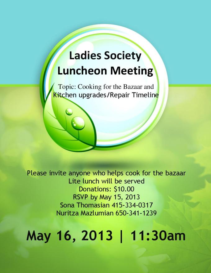 St. John Ladies Society is hosting a luncheon and meeting on Thursday, May 16, 2013 at 11:30am. A light luncheon will be served. The topic of the meeting will be cooking for the Bazaar and kitchen upgrades and the repair timeline. Please invite anyone who helps cook for the bazaar. Donation: $10.00. RSVP by May 15 to Sona at 415-334-0317, or Nuritza at 650-341-1239.