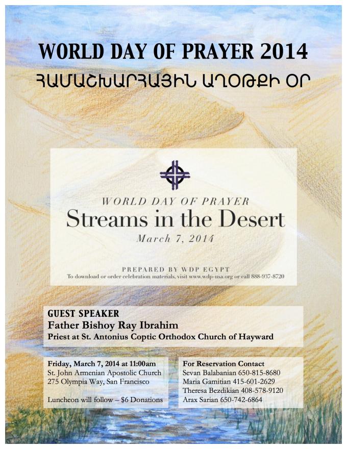 The Bay Area Armenian Ladies will celebrate World Day of Prayer at St. John Armenian Church, 11:00 a.m. Guest Speaker: Father Bishoy Ray Ibrahim, priest at St. Antonius Coptic Orthodox Church of Hayward. Lenten luncheon will follow after the service. Donation $6. For reservation please contact: Sevan Balabanian (650) 815-8680, Maria Gamitian (650) 601-2629, Theresa Bezdikian (408) 578-9120, Arax Sarian (650) 742-6864.