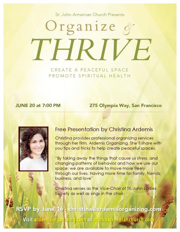 Christina provides professional organizing services through her firm, Ardemis Organizing. She will share with you tips and tricks to help create peaceful spaces.