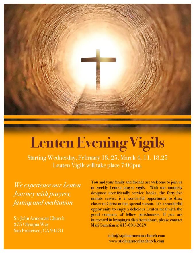 You and your family and friends are welcome to join us in weekly Lenten prayer vigils. With our uniquely designed user-friendly service books, the forty-five minute service is a wonderful opportunity to draw closer to Christ in this special season. It’s a wonderful opportunity to enjoy a delicious Lenten meal with the good company of fellow parishioners. If you are interested in bringing a Lenten dish from home, please contact Agavni Hamamciyan or Mari Gamitian at 415-601-2629.