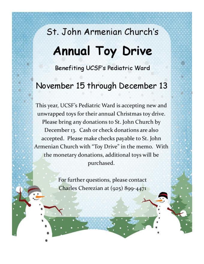 Once again in continuing with tradition, St. John Armenian Church will be hosting the annual toy drive benefiting UCSF’s Pediatric Ward. Please bring your new unwrapped toys to St. John Church by December 13, 2015. If you prefer, cash or check donations are acceptable. Please make check payable to St. John Armenian Church and write Toy Drive in the memo. We can then purchase the toys. If you have any questions, please contact Charles Cherezian (925) 899-4471.