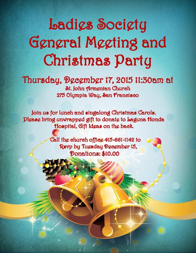 St. John Ladies Society invites you all to the monthly meeting and Christmas Party, Thursday, December 17, 2015 at 11:30am. Please bring unwrapped gift to donate to Laguna Honda Hospital. Call the church office for reservation at 415-661-1142 by December 15. Donation:10.00.
