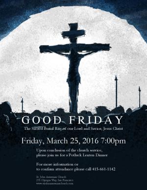 The Sacred Burial Rite of our Lord and Savior, Jesus Christ 7:00pm. Upon conclusion of the church service, please join us for a Potluck Lenten Dinner.