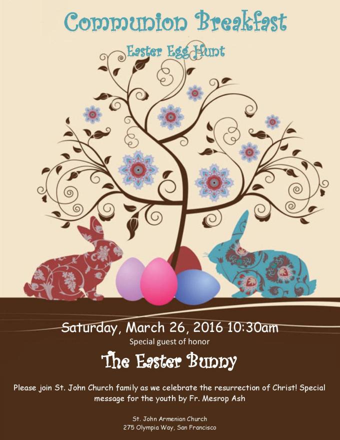 Please join St. John Church family as we celebrate the resurrection of Christ! Special message for the youth by Fr. Mesrop Ash. Followed by breakfast and Easter Egg Hunt.