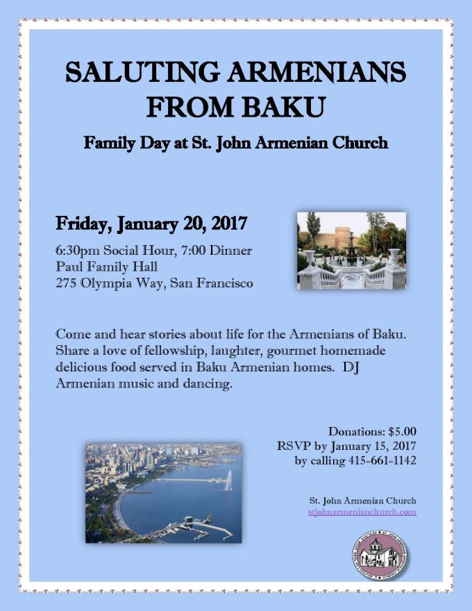 Come to our casual and fun family night, the latest in our "Saluting" series. Hear stories about the life of the Armenians from Baku and enjoy their delicious regional cuisine. There will be a DJ and dancing following the presentation.