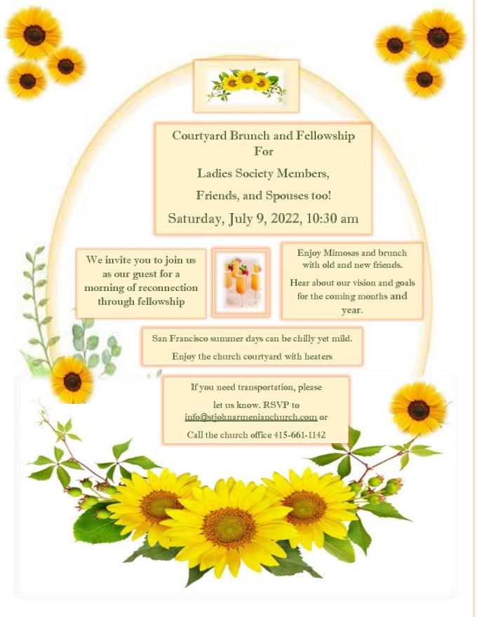 St. John Ladies Socity invites all the members, spouses and friends to a Courtyard Brunch and Fellowship.