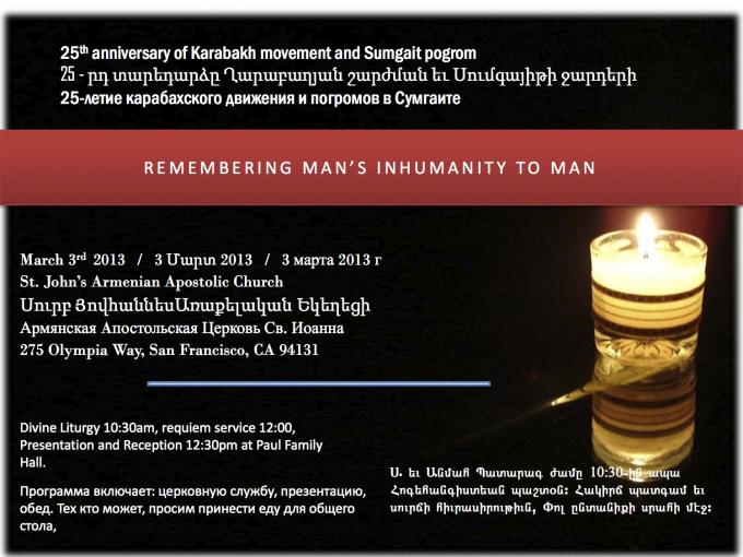 St. John Parish along with the members of the Bay Area Baku-Armenian community will perform requiem services for the souls of the victims of the Sumgayit Massacres. This request comes as our community commemorates the 25th Anniversary of the pogroms. The service will be held at the monument to the victims of the massacres in the courtyard imediately following the Divine Liturgy.
