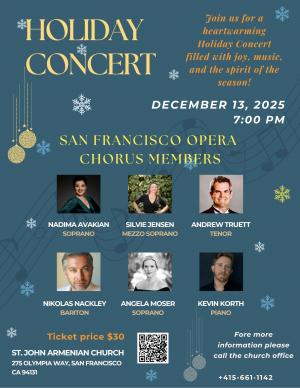 Join us for a heartwarming Holiday Concert filled with joy, music, and the spirit of the season! This special evening will feature members of the San Francisco Opera Chorus and guest artists: